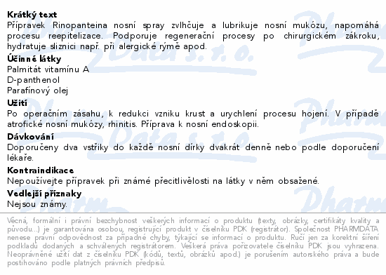 Přípravek Rinopanteina nosní spray zvlhčuje a lubrikuje nosní mukózu, napomáhá procesu reepitelizace. Podporuje regenerační procesy po chirurgickém zákroku, hydratuje sliznici např. při alergické rýmě apod.