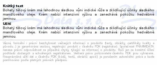 Bohatý tělový krém má lahodnou sladkou vůni indické růže a zklidňující účinky sladkého mandlového oleje. Krém nabízí intenzivní výživu a zanechává pokožku hedvábně jemnou.
