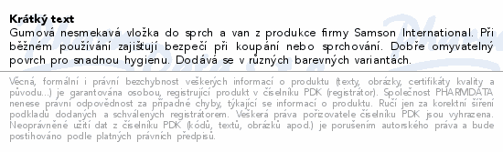 Gumová nesmekavá vložka do sprch a van z produkce firmy Samson International. Při běžném používání zajišťují bezpečí při koupání nebo sprchování. Dobře omyvatelný povrch pro snadnou hygienu. Dodává se v různých barevných variantách.
