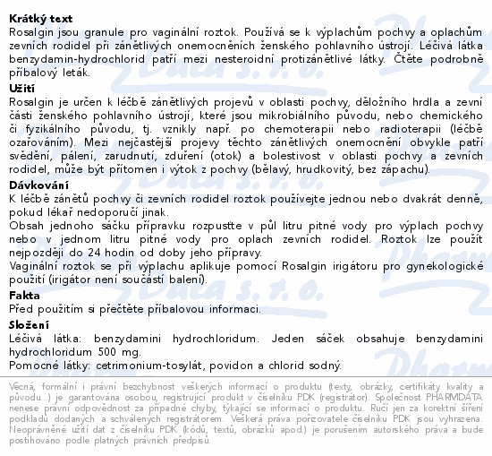 Rosalgin jsou granule pro vaginální roztok. Používá se k výplachům pochvy a oplachům zevních rodidel při zánětlivých onemocněních ženského pohlavního ústrojí. Léčivá látka benzydamin-hydrochlorid patří mezi nesteroidní protizánětlivé látky. Čtěte pozorně příbalový leták.