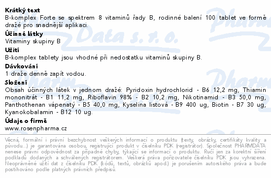 B-komplex Forte se spektrem 8 vitaminů řady B, rodinné balení 100 tablet ve formě dražé pro snadnější aplikaci.