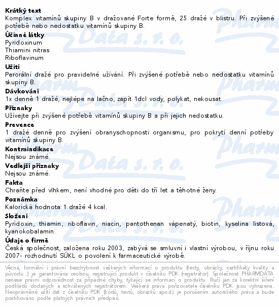 Komplex vitamínů skupiny B v dražované Forte formě, 25 dražé v blistru. Při zvýšené potřebě nebo nedostatku vitamínů skupiny B.