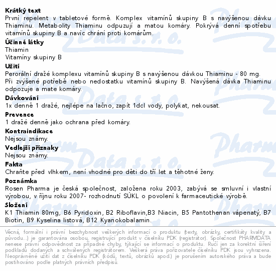 První repelent v tabletové formě. Komplex vitamínů skupiny B s navýšenou dávku Thiaminu. Metabolity Thiaminu odpuzují a matou komáry. Pokrývá denní spotřebu vitamínů skupiny B a navíc chrání proti komárům.
