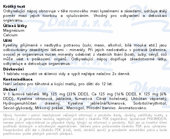 Odkyselující nápoj obnovuje v těle rovnováhu mezi kyselinami a zásadami, udržuje stálý poměr mezi jejich tvorbou a vylučováním. Vhodný pro odkyselení a detoxikaci organismu.