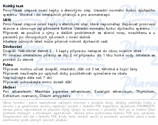 Pinio-Nasal olejové nosní kapky s éterickými oleji. Usnadní normální funkci dýchacího systému. Vhodné i do inhalačních přístrojů a pro aromaterapii.