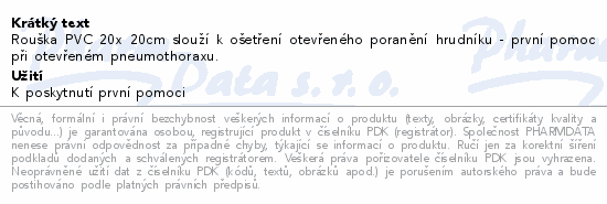 Rouška PVC 20x 20cm slouží k ošetření otevřeného poranění hrudníku - první pomoc při otevřeném pneumothoraxu.