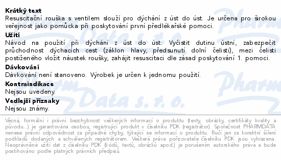 Resuscitační rouška s ventilem slouží pro dýchání z úst do úst. Je určena pro širokou veřejnost jako pomůcka při poskytování první předlékařské pomoci.
