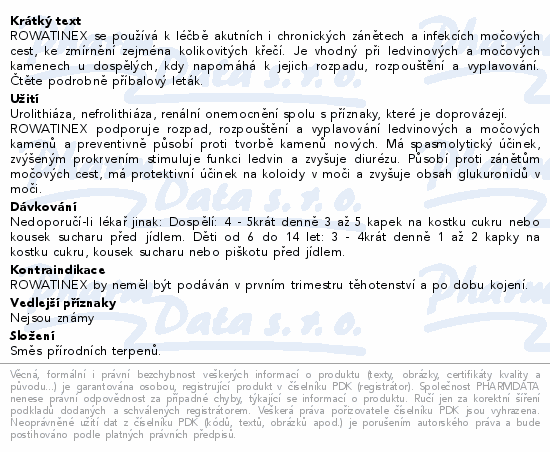 ROWATINEX se používá k léčbě akutních i chronických zánětech a infekcích močových cest, ke zmírnění zejména kolikovitých křečí. Je vhodný při ledvinových a močových kamenech u dospělých, kdy napomáhá k jejich rozpadu, rozpouštění a vyplavování. Čtěte pozorně příbalový leták.