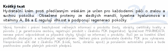 Hydratační krém proti předčasným vráskám je určen pro každodenní péči o zralou a suchou pokožku. Obsažené proteiny ze sladkých mandlí, kyselina hyaluronová a vitaminy A, B6 a E regulují vlhkost a podporují regeneraci pokožky. Obsažené účinné kosmetické látky ve spojení s aktivními vitaminy dodají vaší pokožce osvěžení, obdivuhodný pocit blaha a současně chrání před škodlivými vlivy vnějšího prostředí. Neobsahuje parabeny. Všechny krémy Rugard jsou prověřeny dermatologickým oddělením Univerzity v Kolíně nad Rýnem. V popředí zájmu stojí snášenlivost i pro potencionální alergiky. Přípravky jsou navíc, kromě našich kontrol a zkoušek trvale prověřovány nezávislým odborníkem.