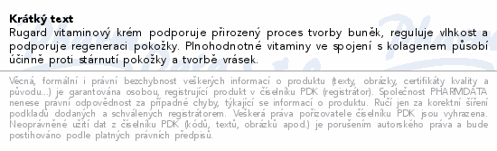 Vitaminový krém proti předčasným vráskám pro každodenní péči o pokožku podporuje přirozený proces tvorby buněk, reguluje vlhkost a podporuje regeneraci pokožky. Obsažené účinné kosmetické látky ve spojení s aktivními vitaminy dodají vaší pokožce obdivuhodný pocit blaha a současně chrání před škodlivými vlivy vnějšího prostředí. Vitaminy ve spojení s kolagenem působí proti předčasnému stárnutí buněk a tvorbě vrásek. Neobsahuje parabeny. Všechny krémy Rugard jsou prověřeny dermatologickým oddělením Univerzity v Kolíně nad Rýnem. V popředí zájmu stojí snášenlivost i pro potencionální alergiky. Přípravky jsou navíc, kromě našich kontrol a zkoušek, trvale prověřovány nezávislým odborníkem.