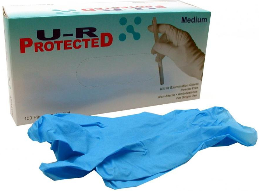 Jednorázové nesterilní vyšetřovací nitrilové rukavice bez pudru, pravolevé, AQL 1,5. Balené v krabičce po 100 kusech.