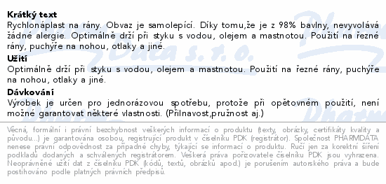 Rychlonáplast na rány. Obvaz je samolepící. Díky tomu,že je z 98% bavlny, nevyvolává žádné alergie. Optimálně drží při styku s vodou, olejem a mastnotou. Použití na řezné rány, puchýře na nohou, otlaky a jiné.