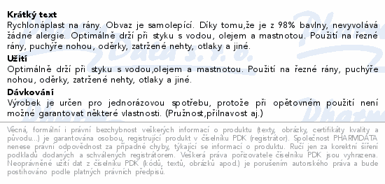 Rychlonáplast na rány. Obvaz je samolepící. Díky tomu,že je z 98% bavlny, nevyvolává žádné alergie. Optimálně drží při styku s vodou, olejem a mastnotou. Použití na řezné rány, puchýře nohou, oděrky, zatržené nehty, otlaky a jiné.