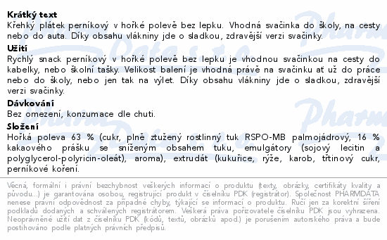 Křehký plátek perníkový v hořké polevě bez lepku. Vhodná svačinka do školy, na cesty nebo do auta. Díky obsahu vlákniny jde o sladkou, zdravější verzi svačinky.