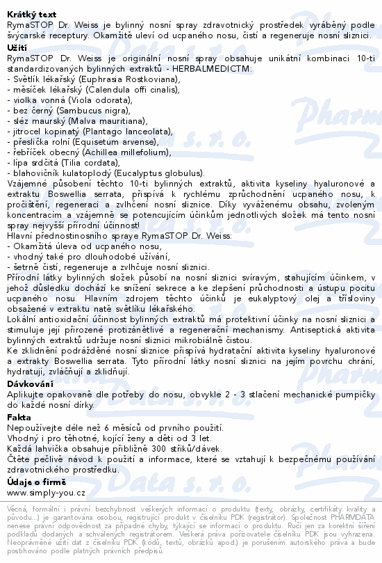 RymaSTOP Dr. Weiss je bylinný nosní spray zdravotnický prostředek vyráběný podle švýcarské receptury. Okamžitě uleví od ucpaného nosu, čistí a regeneruje nosní sliznici.