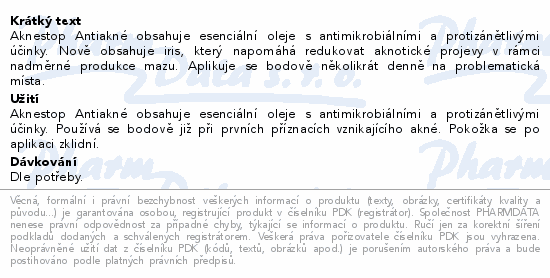 Aknestop Antiakné obsahuje esenciální oleje s antimikrobiálními a protizánětlivými účinky. Nově obsahuje iris, který napomáhá redukovat aknotické projevy v rámci nadměrné produkce mazu. Aplikuje se bodově několikrát denně na problematická místa.