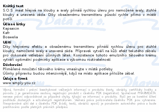 S.O.S. mast hřejivá na klouby a svaly přináší rychlou úlevu pro namožené svaly, ztuhlé klouby a unavená záda. Díky obsaženému transmitteru působí rychle přímo v místě potíží.
