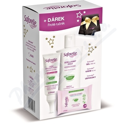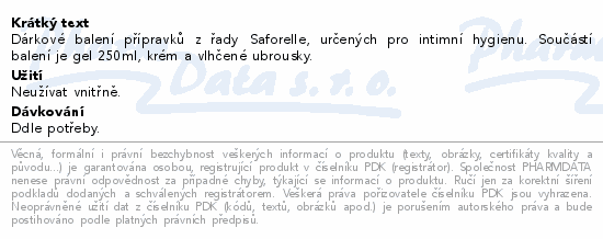Dárkové balení přípravků z řady Saforelle, určených pro intimní hygienu. Součástí balení je gel 250ml, krém a vlhčené ubrousky.