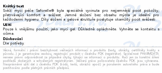 Svěží mycí péče Saforelle® byla speciálně vyvinuta pro nejjemnější pocit pokožky, přetrvávající komfort a svěžest. Jemné složení bez obsahu mýdla je ideální pro každodenní hygienu. Díky složení a gelové struktuře poskytuje okamžitý pocit svěžesti.