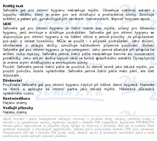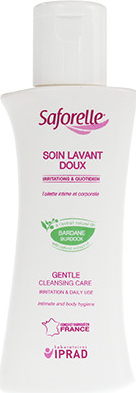 Saforelle gel pro intimní hygienu nebsahuje mýdlo. Obsahuje rostlinný extrakt z lopuchu většího, který je znám pro své zklidňující a protisvědivé účinky. Zmírňuje svědění a pálení při: gynekologických zánětech, hemeroidech, štípnutí hmyzem apod.