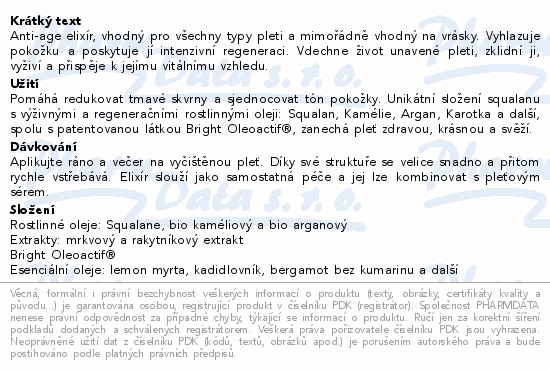 Anti-age elixír, vhodný pro všechny typy pleti a mimořádně vhodný na vrásky. Vyhlazuje pokožku a poskytuje jí intenzivní regeneraci. Vdechne život unavené pleti, zklidní ji, vyživí a přispěje k jejímu vitálnímu vzhledu.