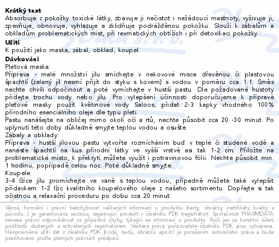 Absorbuje z pokožky toxické látky, zbavuje ji nečistot i nežádoucí mastnoty, vyživuje ji, zpevňuje, obnovuje, vyhlazuje a zklidňuje podrážděnou pokožku. Slouží k zábalům a obkladům problematických míst, při revmatických obtížích i při detoxikaci pokožky.