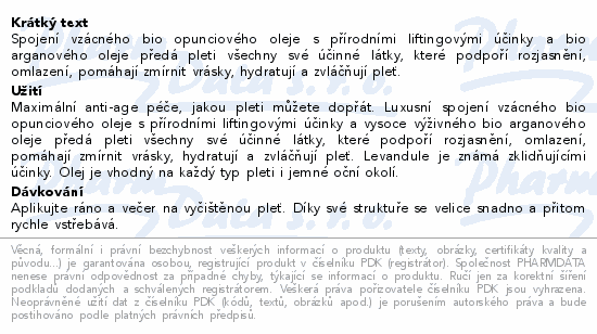 Spojení vzácného bio opunciového oleje s přírodními liftingovými účinky a bio arganového oleje předá pleti všechny své účinné látky, které podpoří rozjasnění, omlazení, pomáhají zmírnit vrásky, hydratují a zvláčňují pleť.