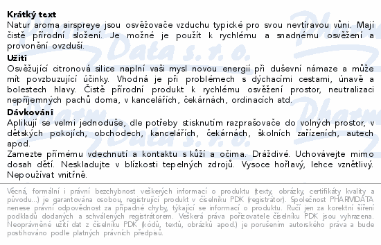 Natur aroma airspreye jsou osvěžovače vzduchu typické pro svou nevtíravou vůni. Mají čistě přírodní složení. Je možné je použít k rychlému a snadnému osvěžení a provonění ovzduší.