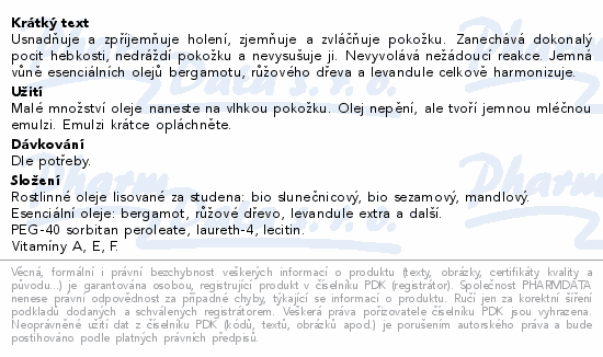 Usnadňuje a zpříjemňuje holení, zjemňuje a zvláčňuje pokožku. Zanechává dokonalý pocit hebkosti, nedráždí pokožku a nevysušuje ji. Nevyvolává nežádoucí reakce. Jemná vůně esenciálních olejů bergamotu, růžového dřeva a levandule celkově harmonizuje.