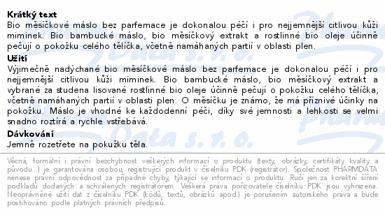 Bio měsíčkové máslo bez parfemace je dokonalou péčí i pro nejjemnější citlivou kůži miminek. Bio bambucké máslo, bio měsíčkový extrakt a rostlinné bio oleje účinně pečují o pokožku celého tělíčka, včetně namáhaných partií v oblasti plen.