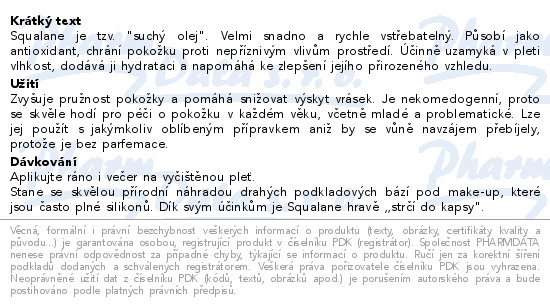 Squalane je tzv. "suchý olej". Velmi snadno a rychle vstřebatelný. Působí jako antioxidant, chrání pokožku proti nepříznivým vlivům prostředí. Účinně uzamyká v pleti vlhkost, dodává ji hydrataci a napomáhá ke zlepšení jejího přirozeného vzhledu.