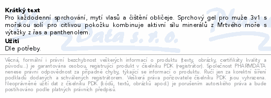 Pro každodenní sprchování, mytí vlasů a čištění obličeje. Sprchový gel pro muže 3v1 s mořskou solí pro citlivou pokožku kombinuje aktivní sílu minerálů z Mrtvého moře s výtažky z řas a panthenolem.