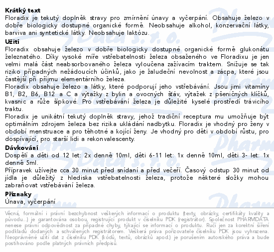Floradix je tekutý doplněk stravy pro zmírnění únavy a vyčerpání. Obsahuje železo v dobře biologicky dostupné organické formě. Neobsahuje alkohol, konzervační látky, barviva ani syntetické látky. Neobsahuje laktózu.