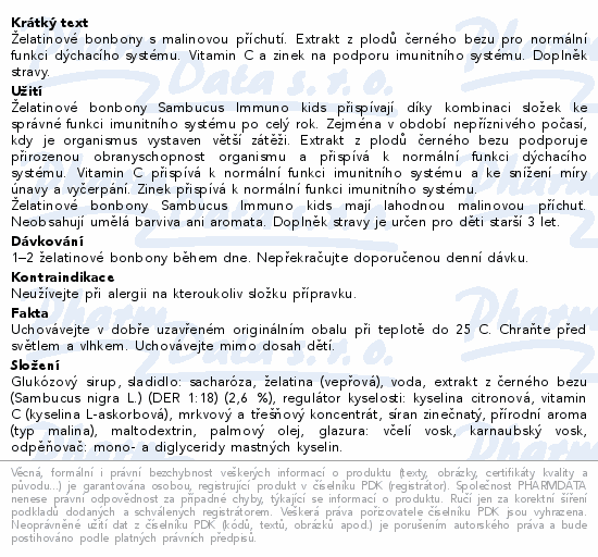 Želatinové bonbony s malinovou příchutí. Extrakt z plodů černého bezu pro normální funkci dýchacího systému. Vitamin C a zinek na podporu imunitního systému. Doplněk stravy.