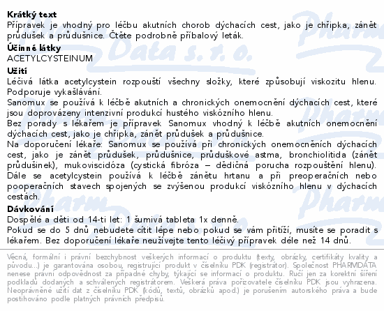| Farmako-terapeutická skupina, účinné látky: | RESPIRAČNÍ SYSTÉM -> LÉČIVA PROTI NACHLAZENÍ A KAŠLI -> EXPEKTORANCIA, KROMĚ KOMBINACÍ S ANTITUSIKY -> MUKOLYTIKA -> ACETYLCYSTEIN |