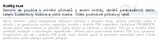 Sanorin se používá k mírnění příznaků u akutní rinitidy, zánětů paranazálních dutin, kataru Eustachovy trubice a otitis media. Čtěte pozorně příbalový leták.