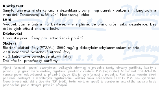 Sanytol univerzální utěrky čistí a dezinfikují plochy. Trojí účinek - bakteriální, fungicidní a virucidní. Zanechávají svěží vůní. Neobsahují chlór.