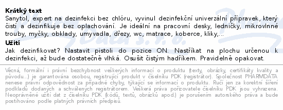 Sanytol, expert na dezinfekci bez chlóru, vyvinul dezinfekční univerzální přípravek, který čistí a dezinfikuje bez oplachování. Je ideální na pracovní desky, ledničky, mikrovlnné trouby, myčky, obklady, umyvadla, dřezy, wc, matrace, koberce, kliky,...