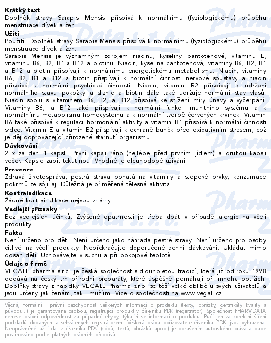 Doplněk stravy Sarapis Mensis přispívá k normálnímu (fyziologickému) průběhu menstruace dívek a žen.