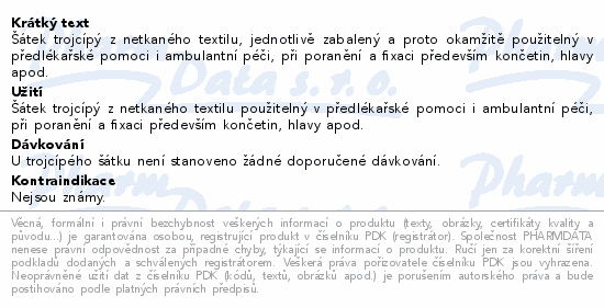 Šátek trojcípý z netkaného textilu, jednotlivě zabalený a proto okamžitě použitelný v předlékařské pomoci i ambulantní péči, při poranění a fixaci především končetin, hlavy apod.