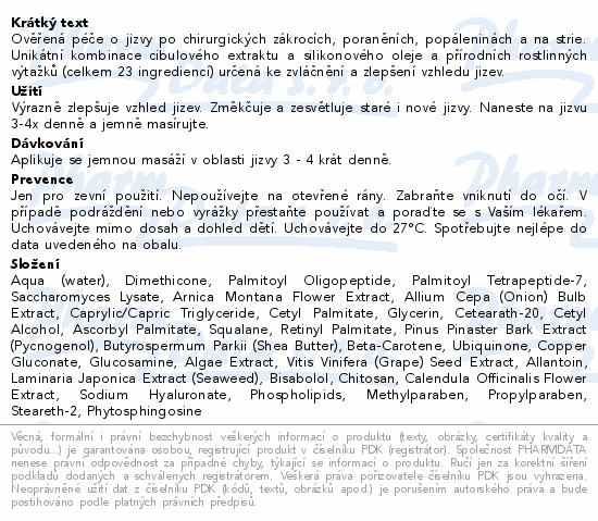 Ověřená péče o jizvy po chirurgických zákrocích, poraněních, popáleninách a na strie. Unikátní kombinace cibulového extraktu a silikonového oleje a přírodních rostlinných výtažků (celkem 23 ingrediencí) určená ke zvláčnění a zlepšení vzhledu jizev.