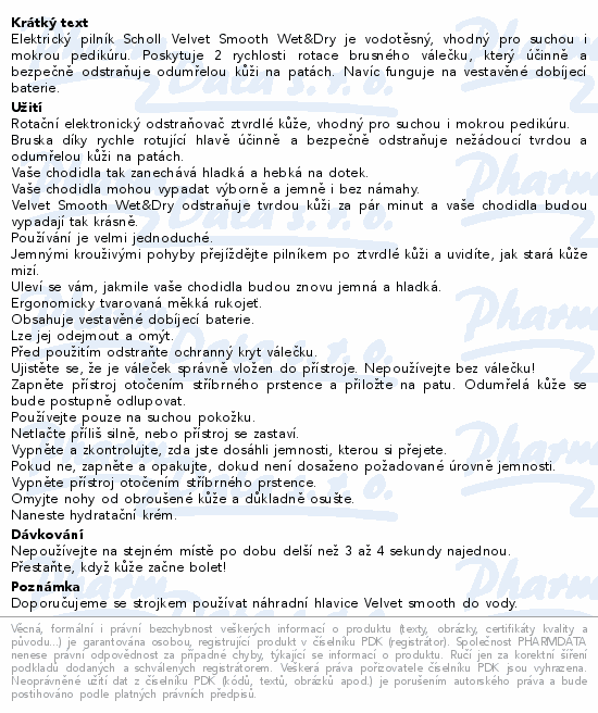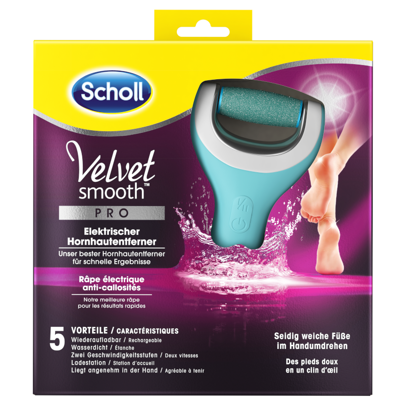 Elektrický pilník Scholl Velvet Smooth Wet&Dry je vodotěsný, vhodný pro suchou i mokrou pedikúru. Poskytuje 2 rychlosti rotace brusného válečku, který účinně a bezpečně odstraňuje odumřelou kůži na patách. Navíc funguje na vestavěné dobíjecí baterie.
