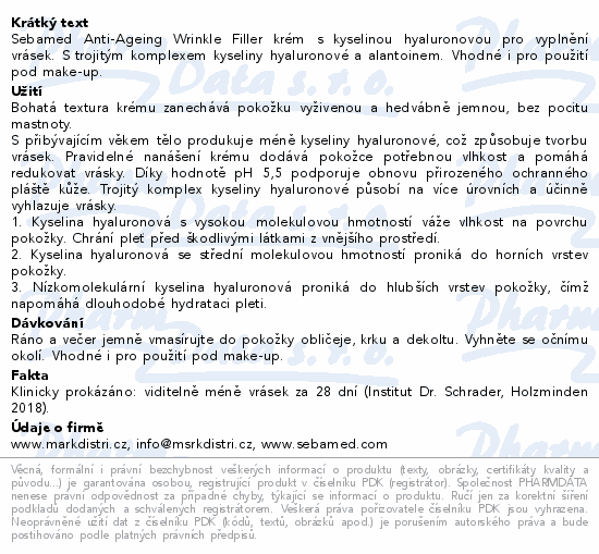 Sebamed Anti-Ageing Wrinkle Filler krém s kyselinou hyaluronovou pro vyplnění vrásek. S trojitým komplexem kyseliny hyaluronové a alantoinem. Vhodné i pro použití pod make-up.