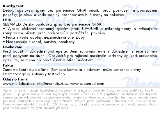 Dětský opalovací spray bez parfemace OF50 působí proti poškození a podráždění pokožky, je písku a vodě odolný, nezanechává bílé stopy na pokožce.