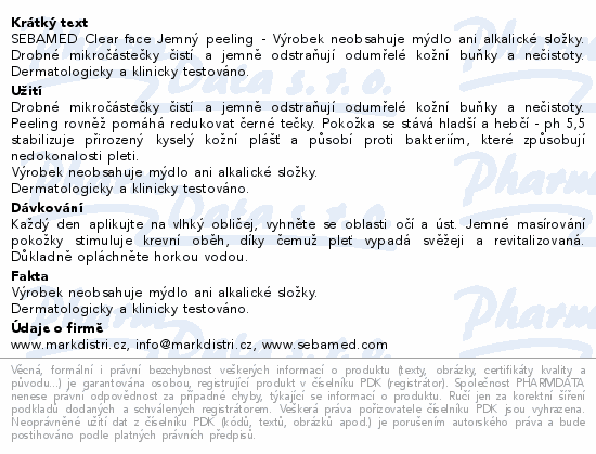 SEBAMED Clear face Jemný peeling - Výrobek neobsahuje mýdlo ani alkalické složky. Drobné mikročástečky čistí a jemně odstraňují odumřelé kožní buňky a nečistoty. Dermatologicky a klinicky testováno.