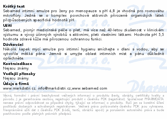 Sebamed intimní emulze pro ženy po menopauze s pH 6,8 je vhodná pro rovnováhu mikroflóry. Jedná se o komplex povrchově aktivních přirozeně organických látek přizpůsobených specifické hodnotě pH.
