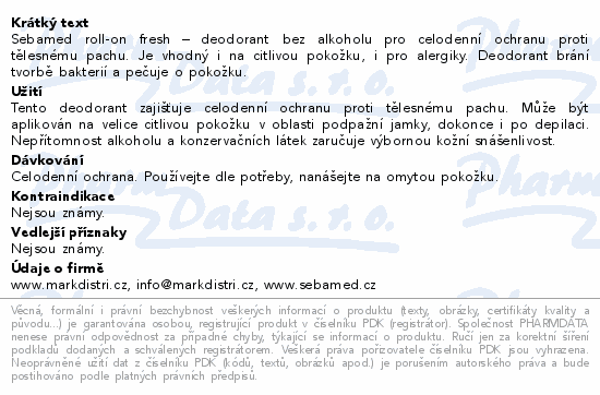 Sebamed roll-on fresh – deodorant bez alkoholu pro celodenní ochranu proti tělesnému pachu. Je vhodný i na citlivou pokožku, i pro alergiky. Deodorant brání tvorbě bakterií a pečuje o pokožku.