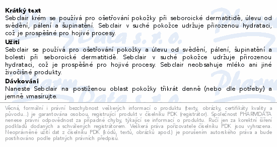 Sebclair krém se používá pro ošetřování pokožky při seboroické dermatitidě, úlevu od svědění, pálení a šupinatění. Sebclair v suché pokožce udržuje přirozenou hydrataci, což je prospěšné pro hojivé procesy.