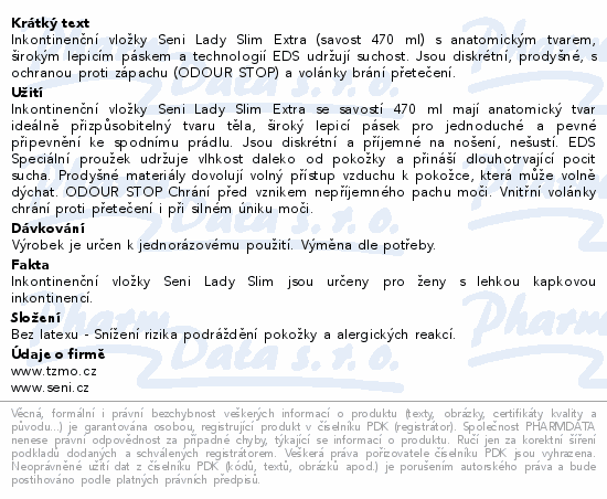 Inkontinenční vložky Seni Lady Slim Extra (savost 470 ml) s anatomickým tvarem, širokým lepicím páskem a technologií EDS udržují suchost. Jsou diskrétní, prodyšné, s ochranou proti zápachu (ODOUR STOP) a volánky brání přetečení.