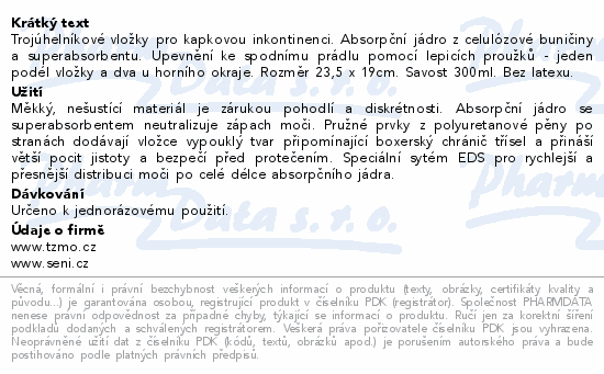 Trojúhelníkové vložky pro kapkovou inkontinenci. Absorpční jádro z celulózové buničiny a superabsorbentu. Upevnění ke spodnímu prádlu pomocí lepicích proužků - jeden podél vložky a dva u horního okraje. Rozměr 23,5 x 19cm. Savost 300ml. Bez latexu.